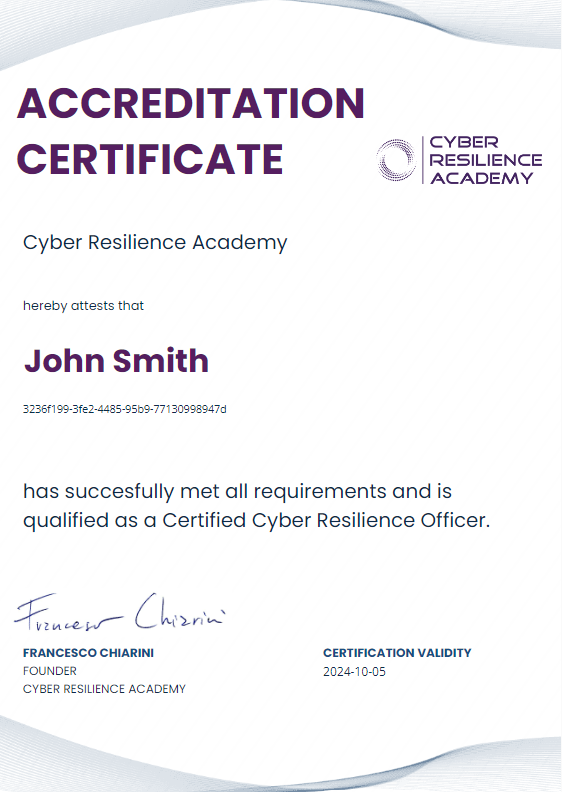 I'm happy to share that I've obtained a new certification: Certified Cyber Resilience Officer from Cyber Resilience Academy. Huge thanks to Francesco Chiarini for delivering a high quality and practical course.